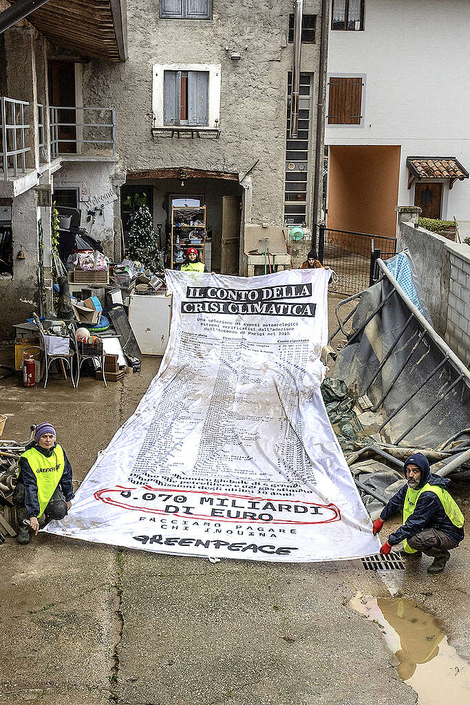 Nella giornata conclusiva della COP30 a Belém, Greenpeace Italia ha srotolato un enorme scontrino con il conto della crisi climatica a Versa, nel Goriziano, tra le aree più colpite dall’alluvione in Friuli-Venezia Giulia, dove volontari e volontarie di Greenpeace sono ancora all’opera per aiutare la popolazione a liberare le case e le strade dal fango. Lo scontrino è un lungo elenco di eventi climatici estremi verificatisi negli ultimi 10 anni, dall’Accordo di Parigi sul clima a oggi – a cui si aggiungono eventi come quello di questi giorni -, e una stima dei costi che la collettività sta già pagando e pagherà a causa delle emissioni senza controllo delle grandi aziende del petrolio e del gas. L’appello rivolto ai governi riuniti alla Conferenza delle Nazioni Unite sul Clima (COP30) in Brasile è di far pagare i grandi inquinatori e utilizzare i ricavi per finanziare seriamente la transizione energetica e la sicurezza del territorio in cui viviamo.